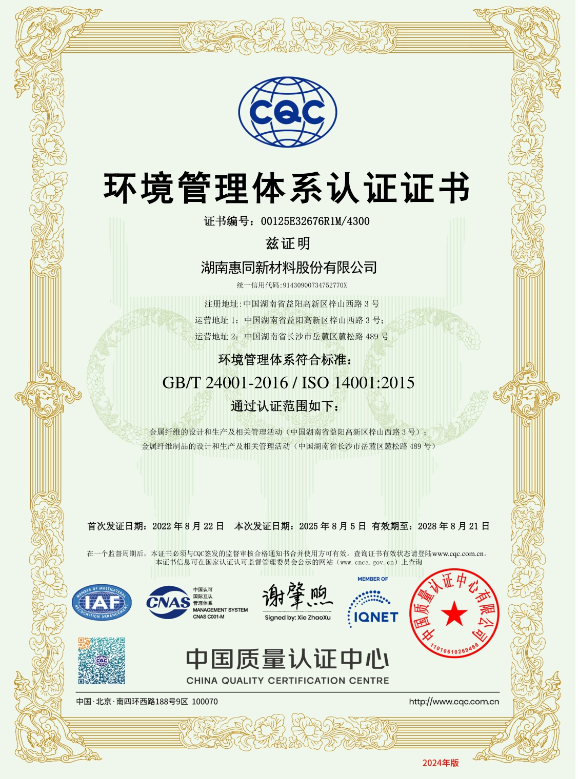 ISO14001:2015環(huán)境管理體系認(rèn)證證書